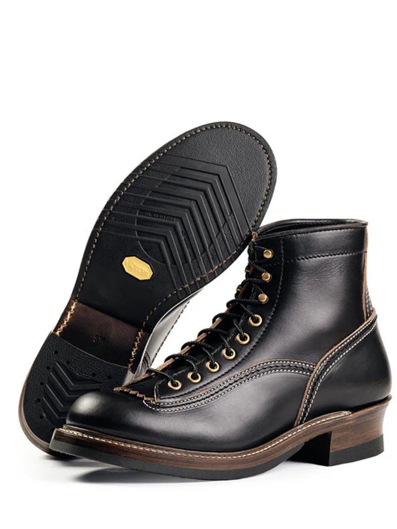 The Donkey Puncher is a logger-style lace-to-toe boot made of a Horween Black Chromexcel and lined with Japanese horsehide. These boots are constructed with the highest-quality stitching and craftsmanship, and are renowned for their immediate comfort from the start. The name Donkey Puncher comes from the engineer that operated a "steam donkey", a piece of machinery used for logging in the late 19th century.