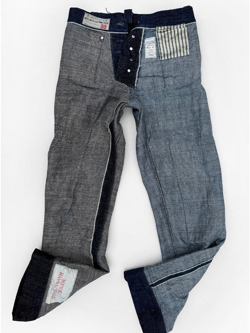 Unique asymmetric leg pattern design, one selvedge inseam wrap leg, one selvedge outseam leg.