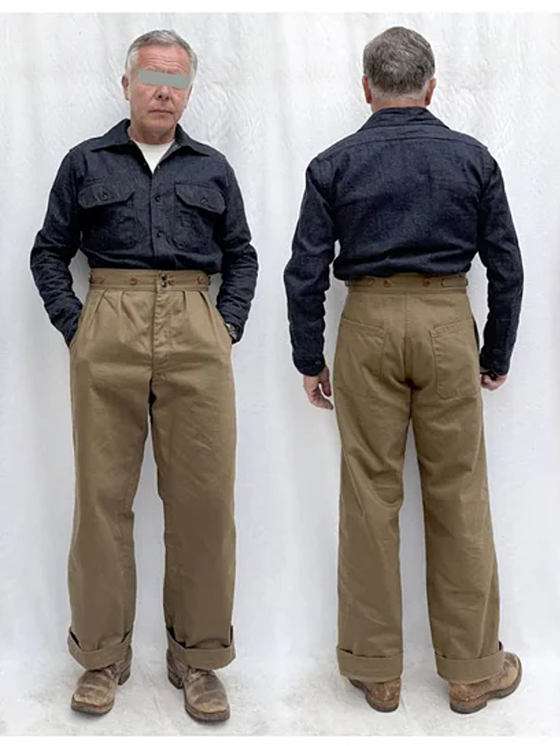 Pattern: An MF® twist on an uncommon piece of military gear: vintage 1952 Australian drill trousers. Key features of this utilitarian design include a snap button fly closure, high waist, pleated front, and wide-leg cut.