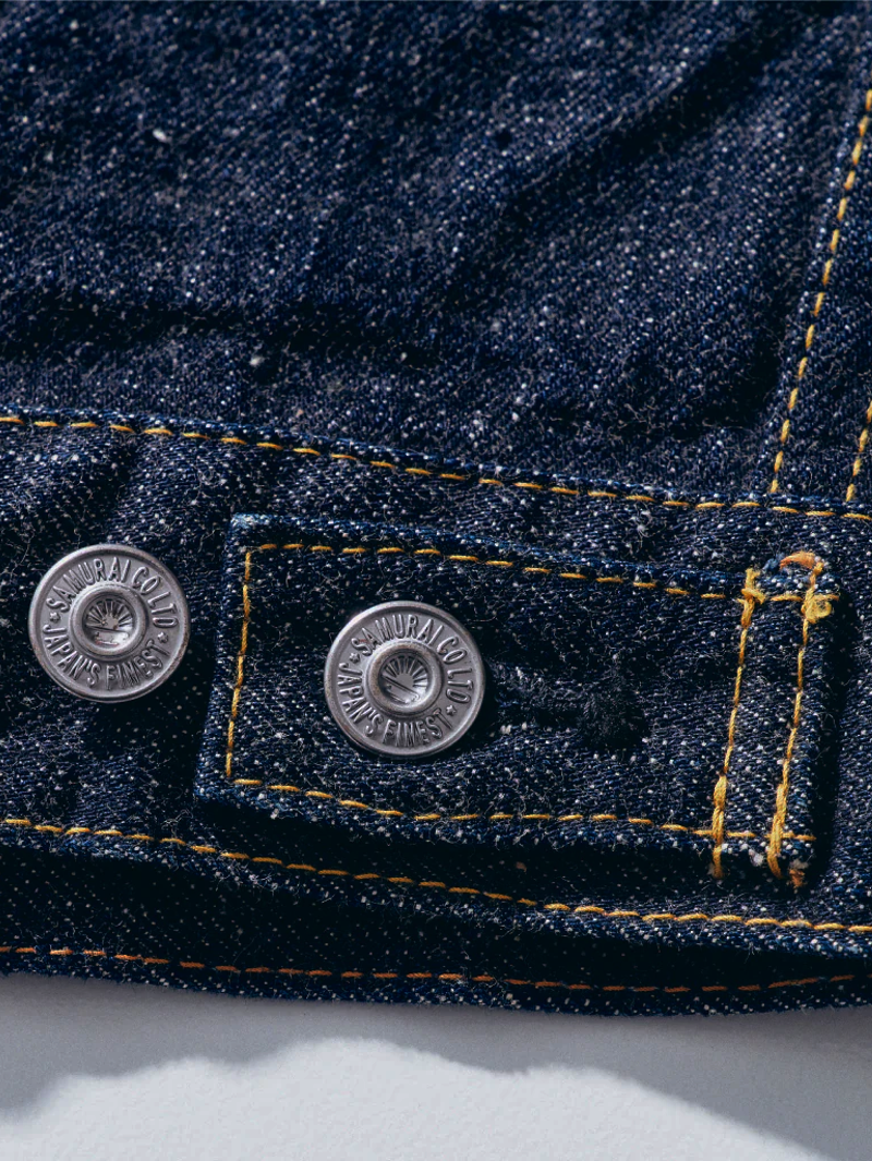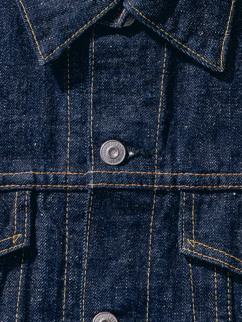 This denim fabric is called “Otokogi” which translates as “chivalry” or “courage” and is made from slubby #6 yarn that has had the little bits of leaf and stem left in. The result is a rough, crisp denim that provides incredible vertical fading. Unique to the 3rd type jean jacket, a light ounce denim is used for the pocket design and back flap lining. This is the slimmest silhouette in the Samurai jean jacket series.