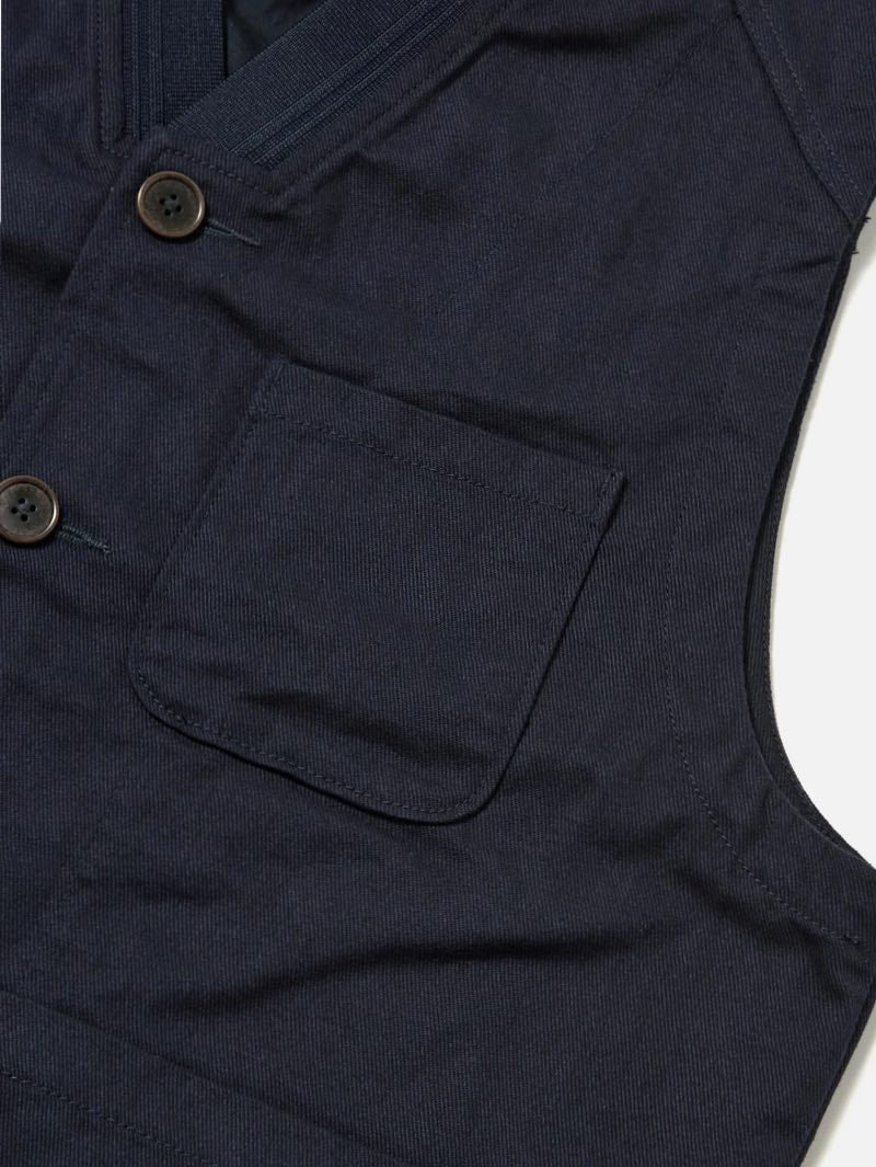 A loose fit gilet with an inset ribbed neck line, waist adjusters 3 patch pockets and a small off-set ticket pocket.