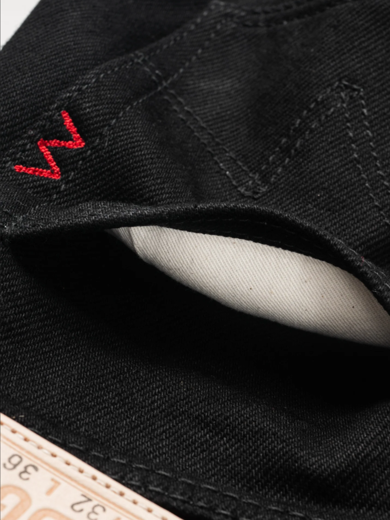 Straight cut jean, made out of 21oz "Super Black Fades to Grey" (SBG) selvedge denim. This denim has a black sulphur dyed warp and a black reactive dyed weft. With time the warp will fade but the weft won't. It is heavy, tough, yet soft and extremely breathable. Because of the double twisted weft construction, this denim moulds to an individual's body shape like no other denim.
