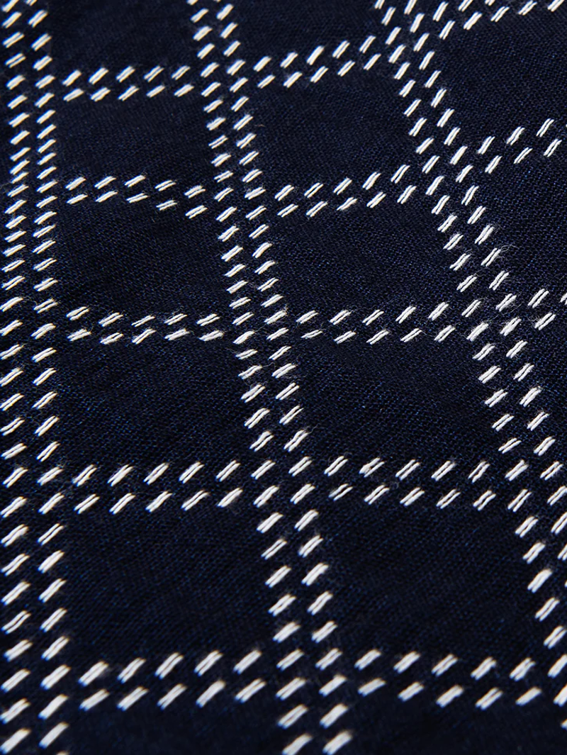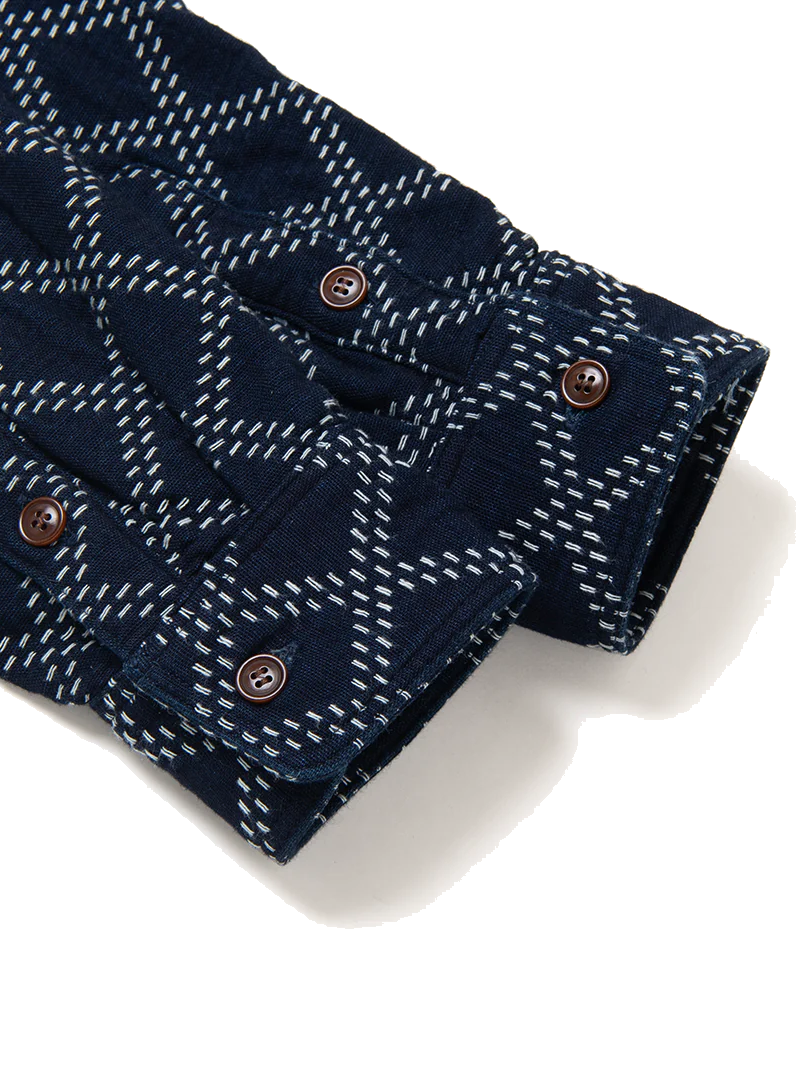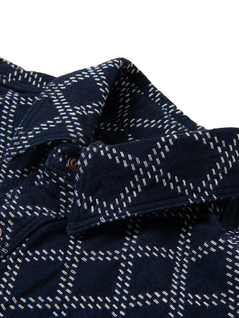 This indigo dobby sashiko shirt features thick sashiko yarn, designed to create a unique volume with washing due to the different shrinkage rates . Enjoy the beautiful aging process that only indigo can provide . Nut buttons add a touch of elegance to the shirt .