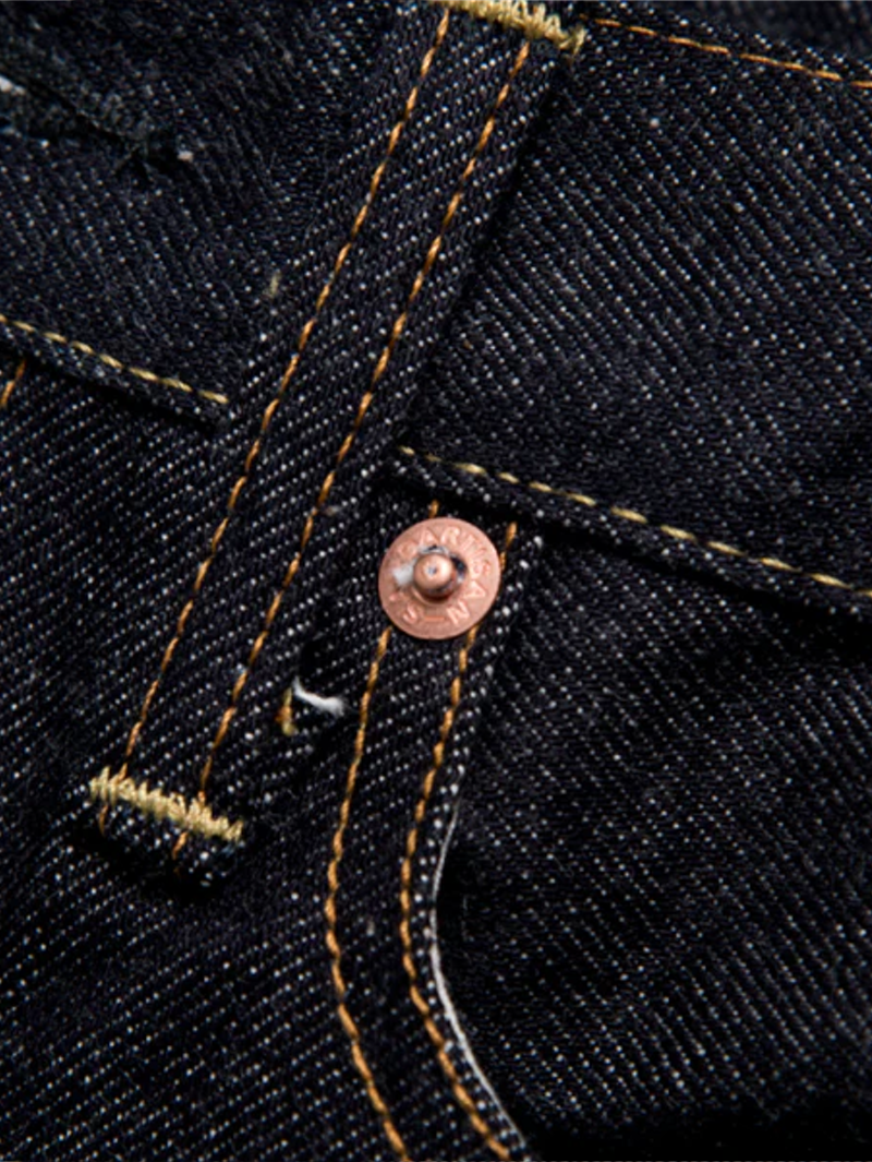 Crafted from a sturdy 15oz fabric, they offer a striking contrast as they age. While they share the same silhouette as the "SD-102" model, they feature a cinch back, a hardware detail from the early 1900s, giving them a period-correct feel.
