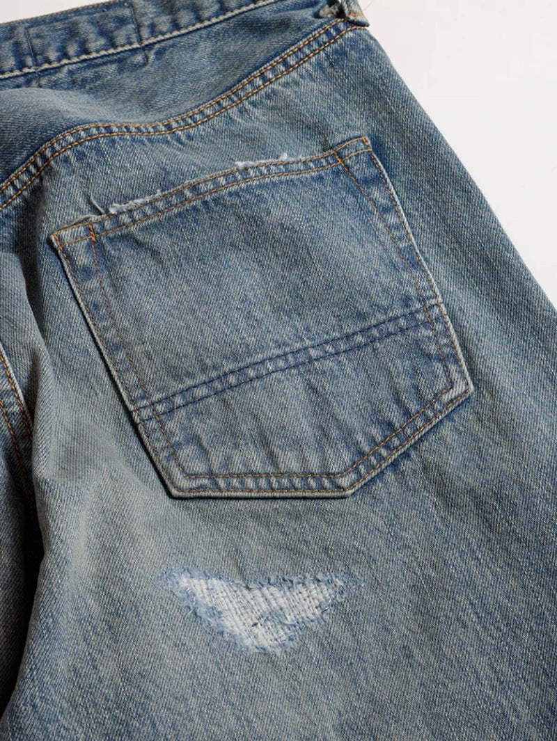 The wide fit denim features a silhouette with more room around the knees and a tapered shape toward the hem.