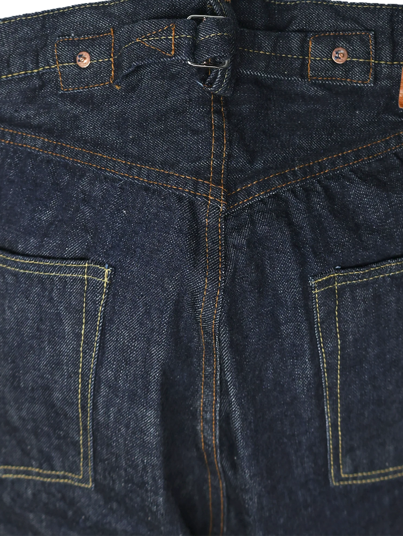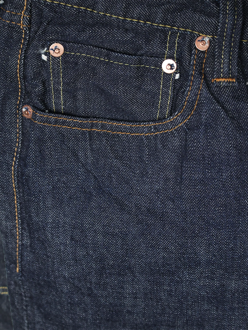 This model is from an era when jeans were held up by suspenders. The majority of people shifted to wearing belts however with the advent of the automobile (the hidden rivets scratched the seats), so suspender buttons were abolished and hidden rivets came into use. These are full of details that enthusiasts will love, such as the back strap with pronged buckle, the high yoke with rolled stitching, and the bar tacked back center belt loop. The new yellow stitching created specially for this model uses a dye that changes with the fading of the denim.
