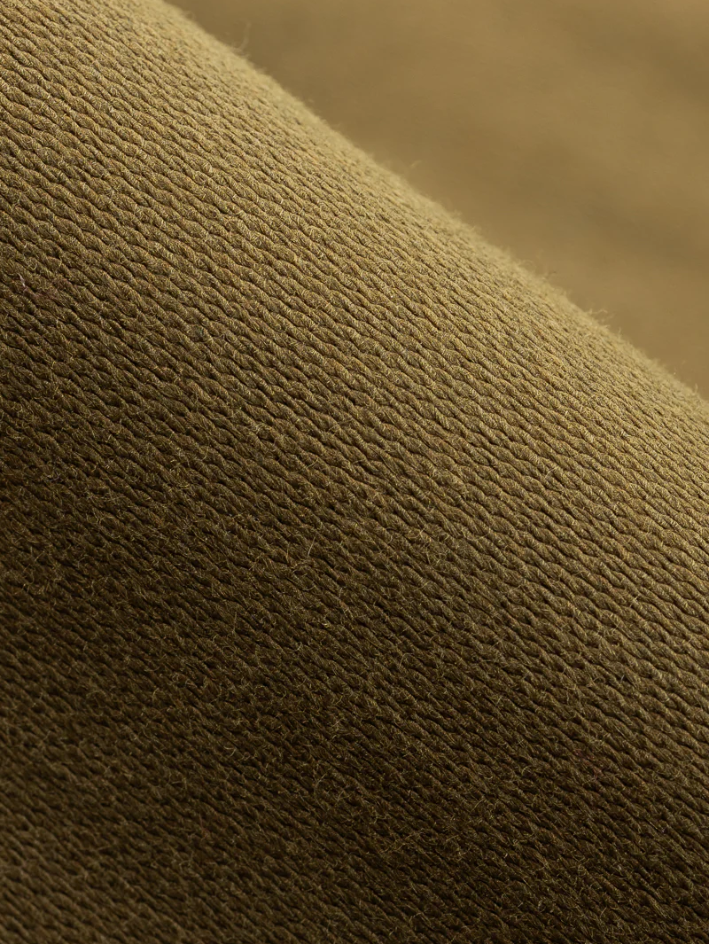 Weighing a hefty 12oz, this moleskin takes inspiration from vintage European military fabrics, similar to a German army moleskin. This means it's woven tighter and thicker than our previous moleskin fabrics, and is less heavily brushed to retain a little stiffness. To create a vintage military aesthetic, it's woven using sulphur-dyed yarns, allowing the colour to mellow with wear for a muted, timeworn appearance. Finished with tonal stitching and black heavy-duty snap fastenings.