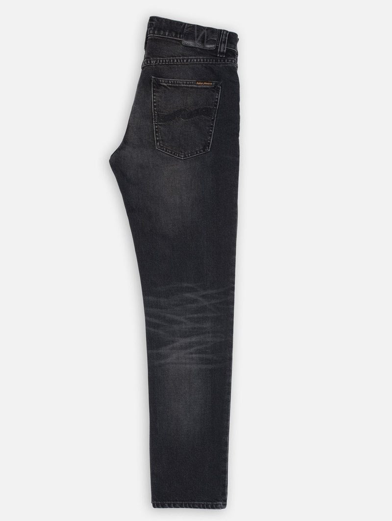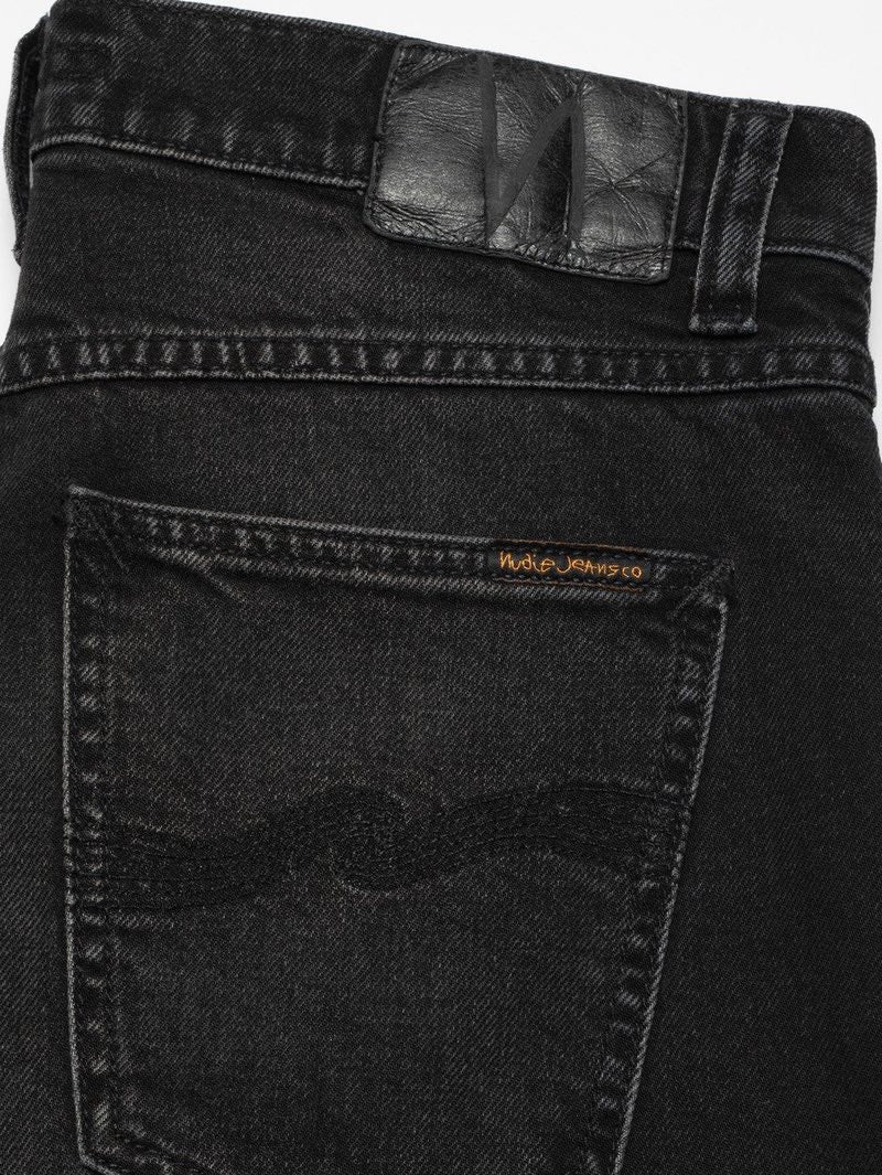 Slim-fit jeans with a slim leg, crafted from pitch-black denim with a defined texture. These jeans feature a striking contrast of highs and lows, enhanced by sharp abrasions and wear marks that deepen their worn-in look. The result is a beautifully rugged, well-aged appearance.
