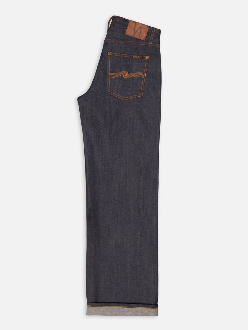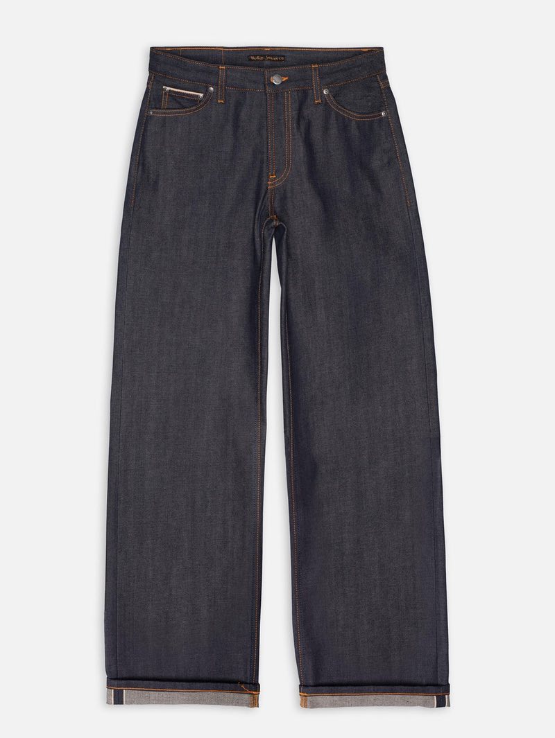 Loose, low-waist fit with a wide leg, made from 13.75 oz. Kaihara selvage denim. Tightly woven with slubby yarns and an orange selvage ID line. Made from organic cotton.