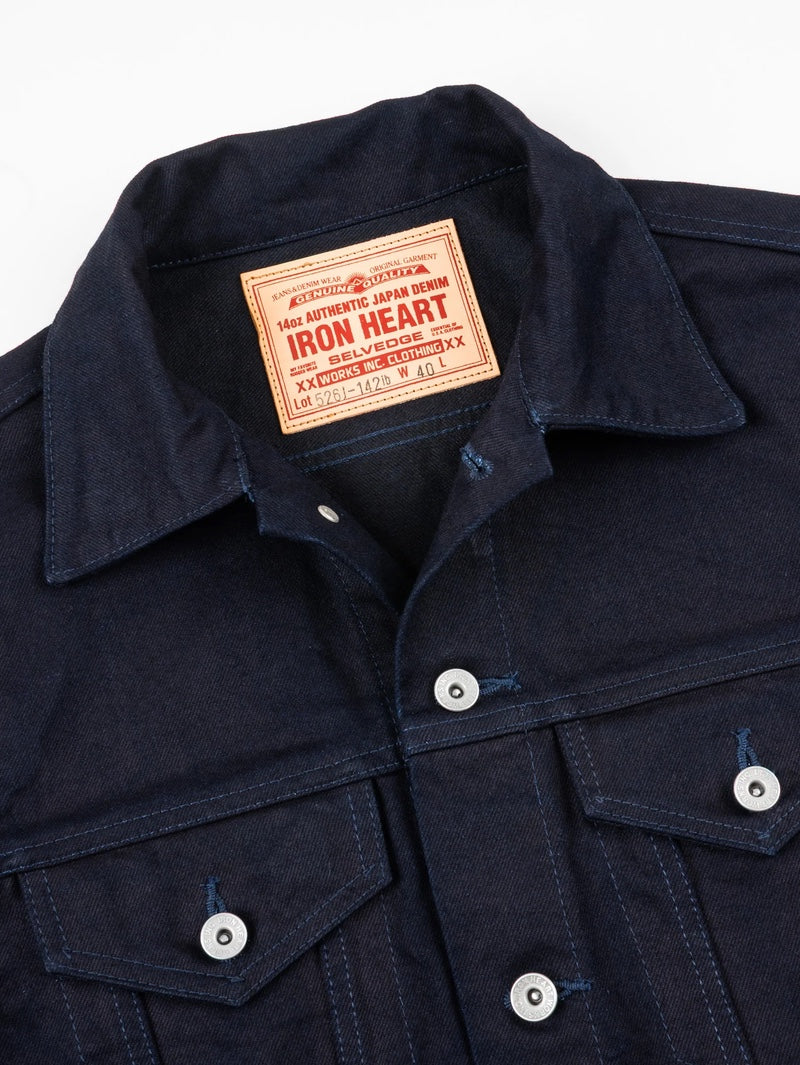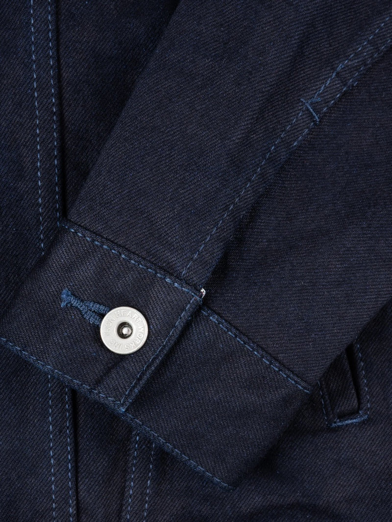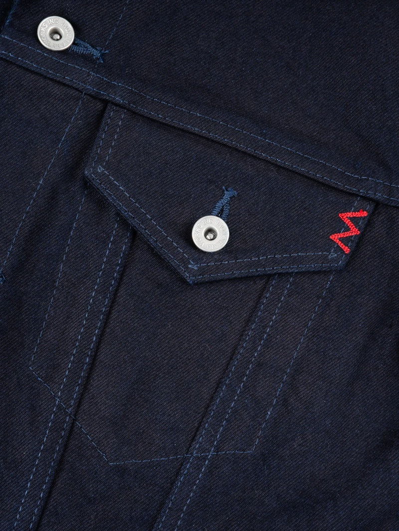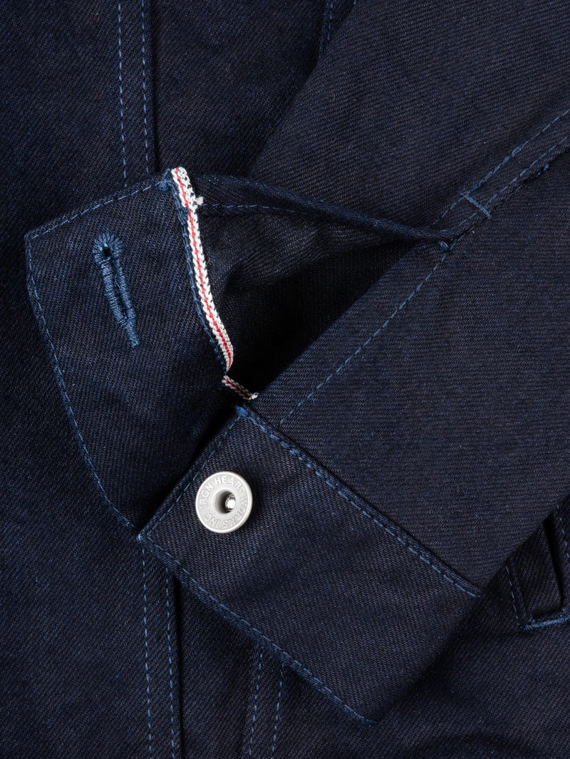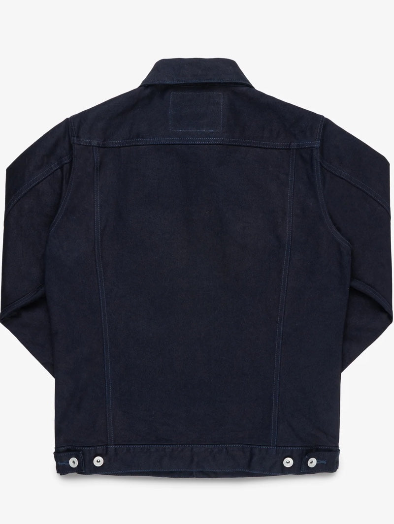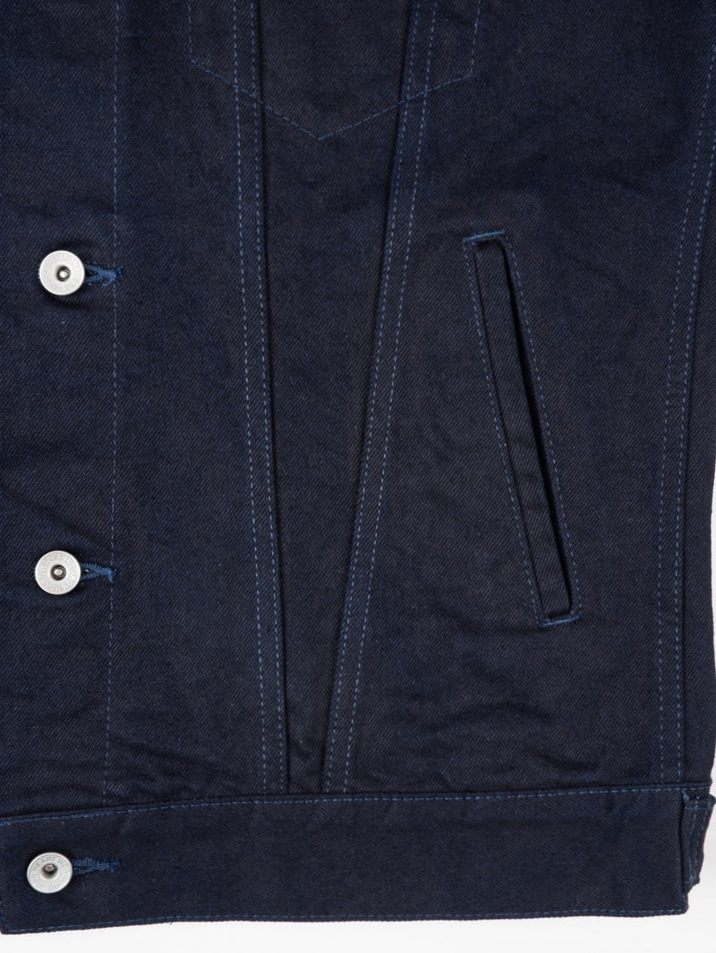 Classic Type III jacket, modified with a slightly longer than traditional body and with the addition of side handwarmer pockets, made from our 14oz indigo/black selvedge denim.