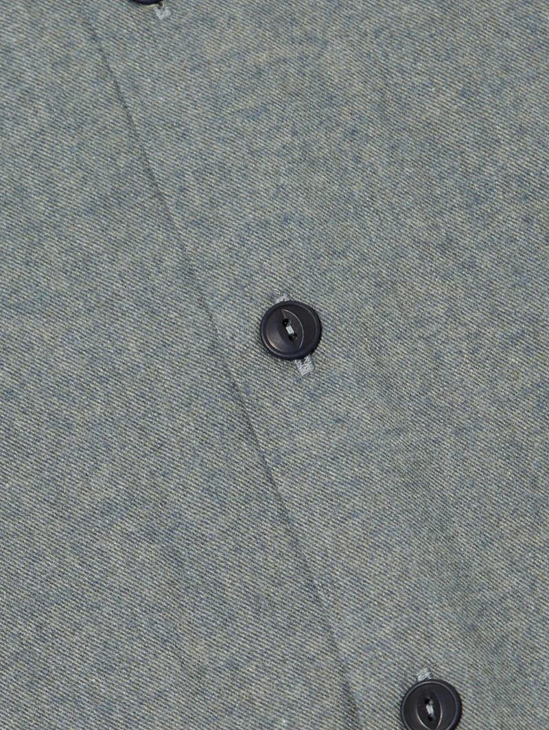 A two-pocket, easy-to-wear overshirt, with a one piece collar designed to be worn open, but with the addition of a button and loop closure.