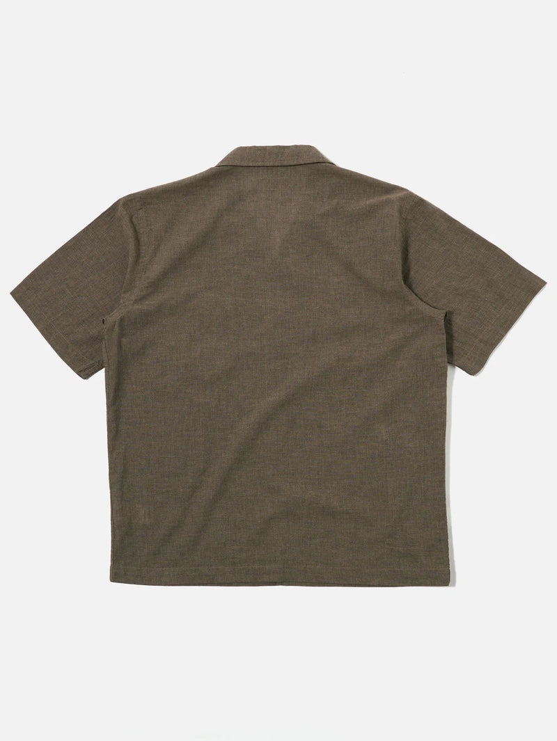 Sal Road Shirt is regular fitting, straight hem, no-fuss short sleeve shirt but with 2 chest pockets instead of one. The one-piece collar is designed to be worn open-necked, but with the option to button up with a loop closure.