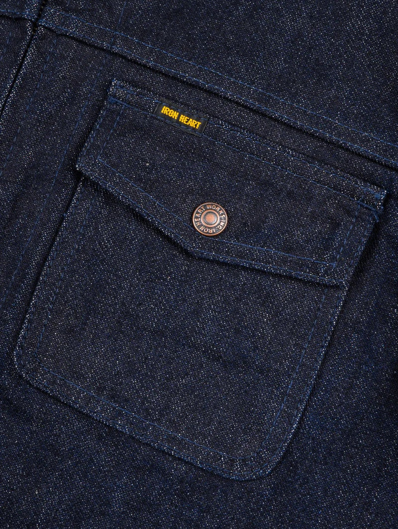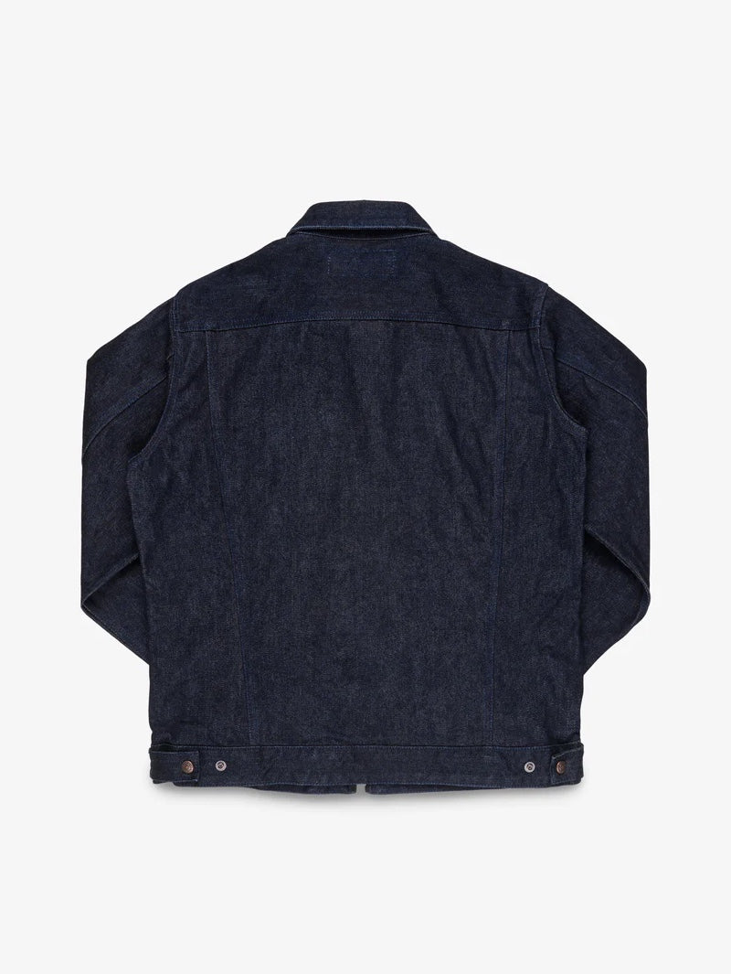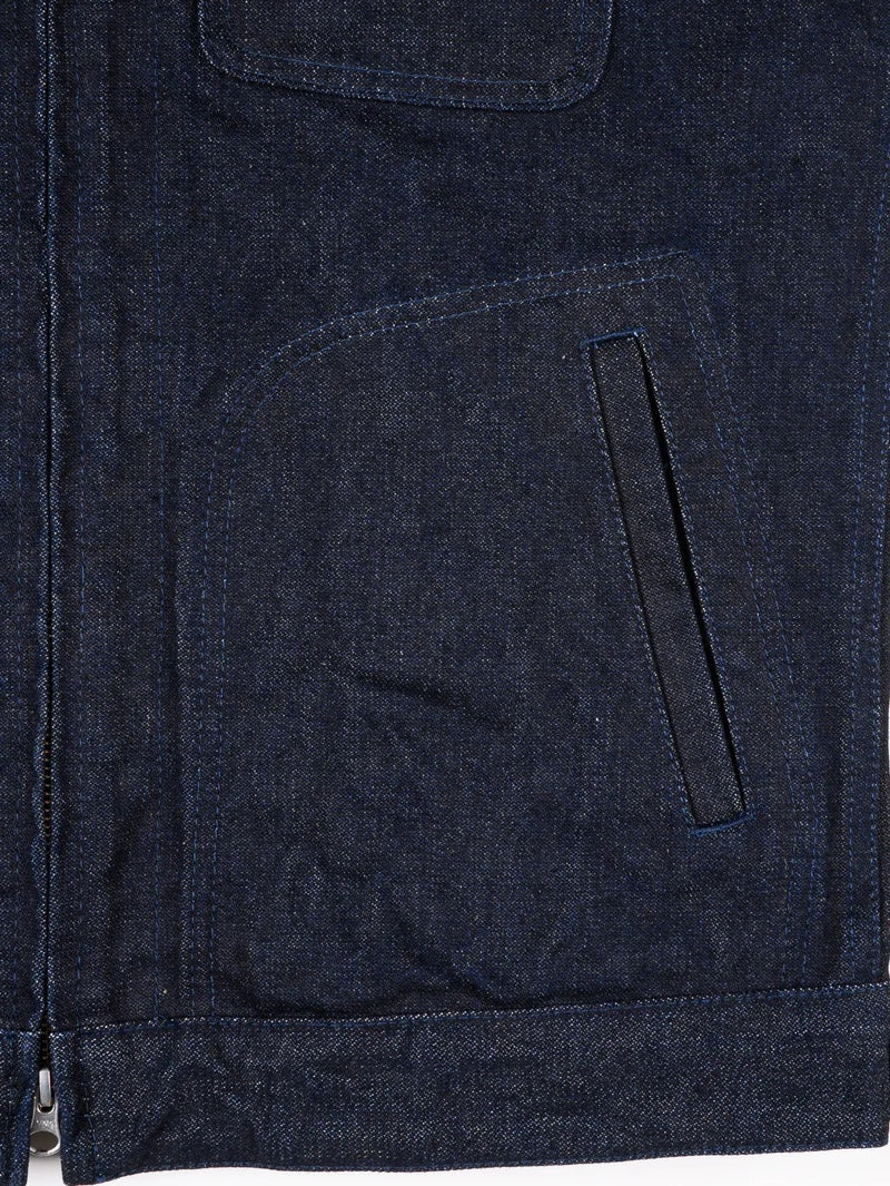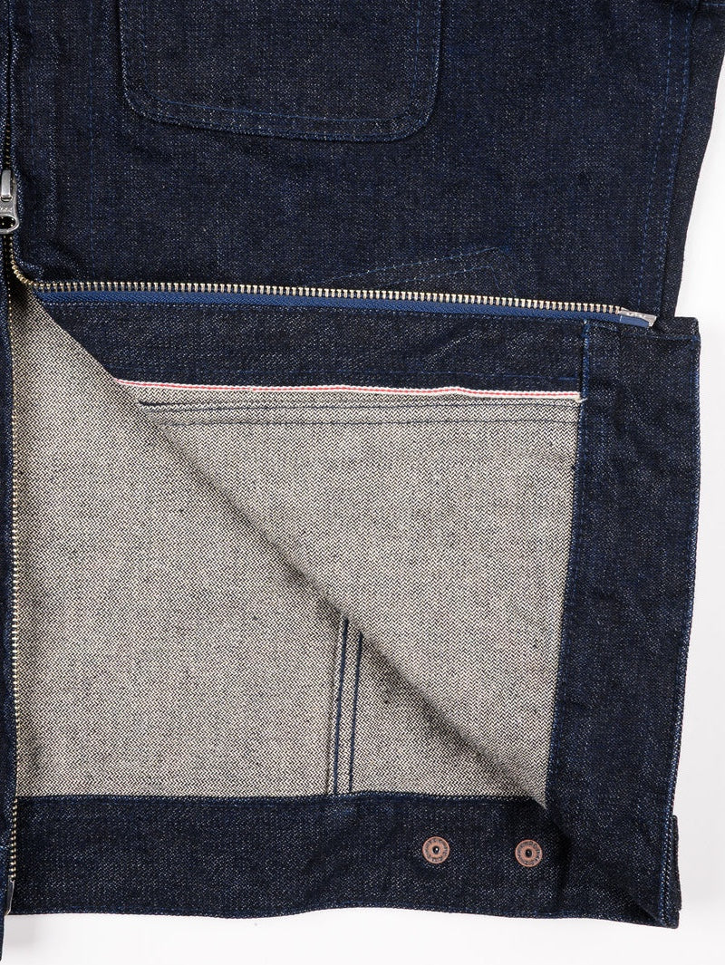 Zippered work jacket, made from 14oz broken twill selvedge denim. Broken twill denim was first used in 1964 by Wrangler as a solution for combatting fabric twist caused by the directional torque generated in the weaving process. The process of weaving fabric in this method sees the combination of both right hand twill (RHT) and left hand twill (LHT) reversed every two warp ends, forming a zigzag-like pattern in the denim and resulting in no bias in either direction of the weave.