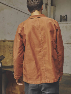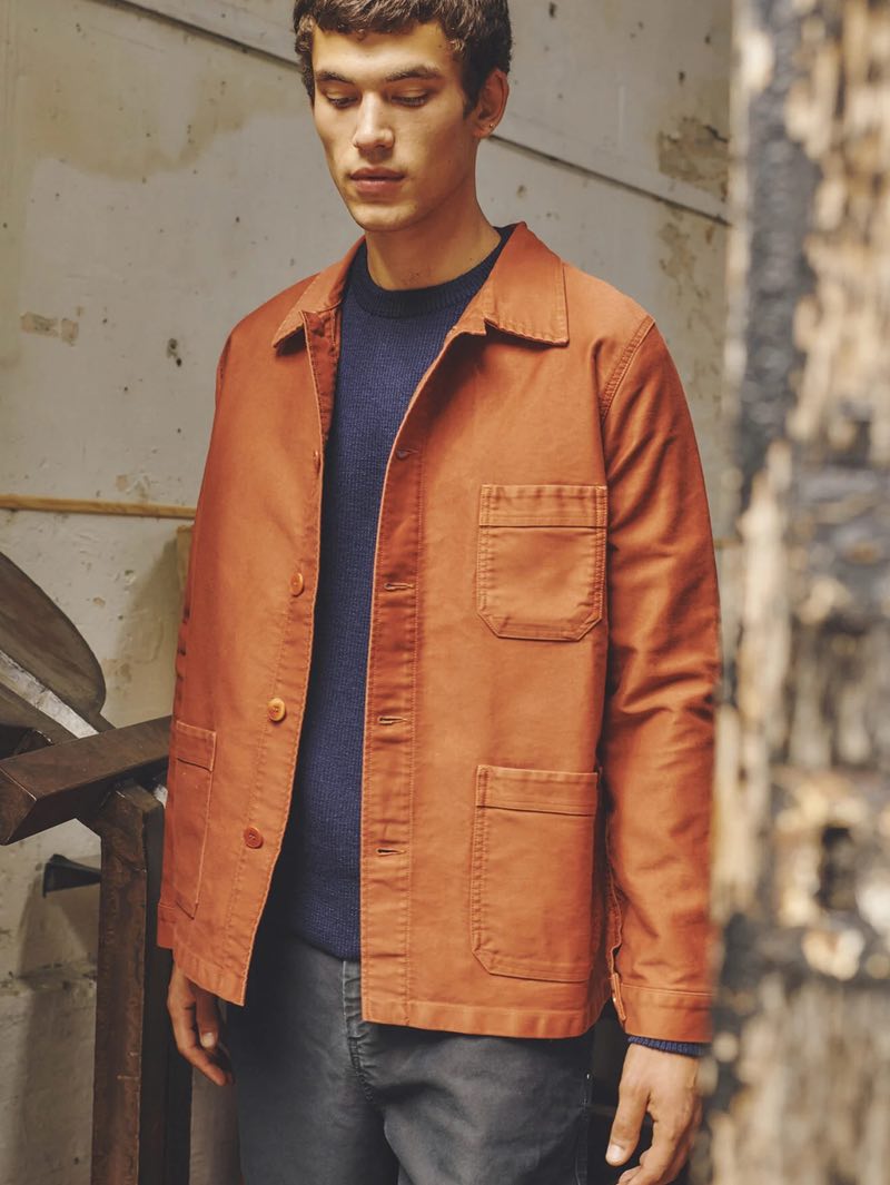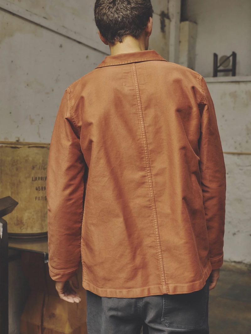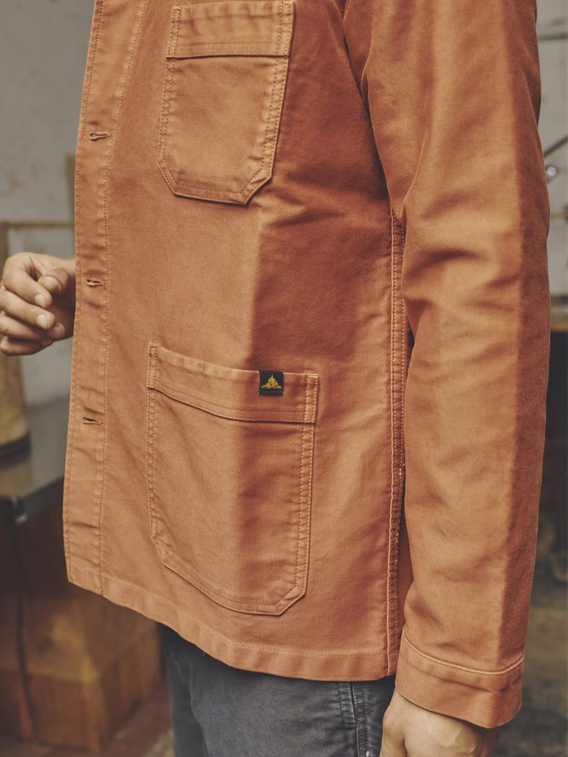 The jacket's fabric, 100% cotton moleskin, is woven in France in a workshop that has been perpetuating traditional know-how for over a hundred years. Renowned for its high resistance and water-repellent properties, this material ensures the jacket's exceptional durability. It is easy to care for, requiring washing at 30°C and air-drying to maintain its quality over time.