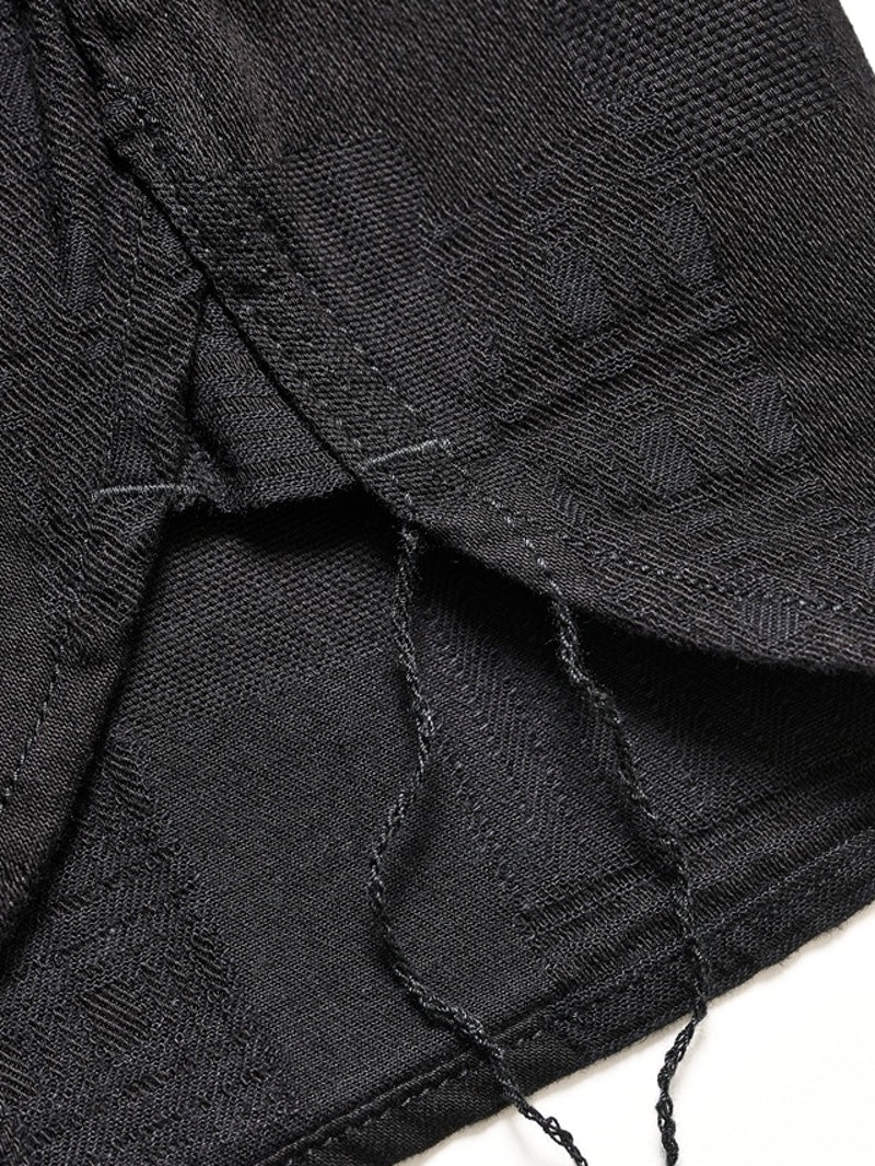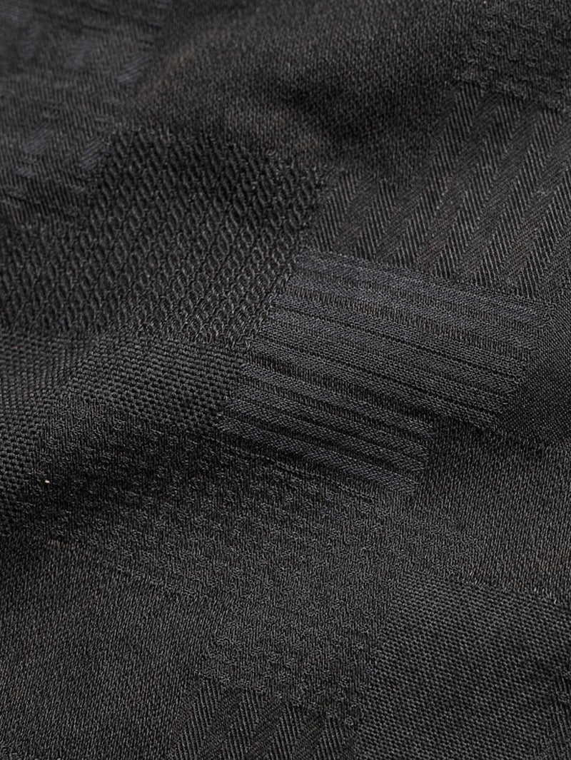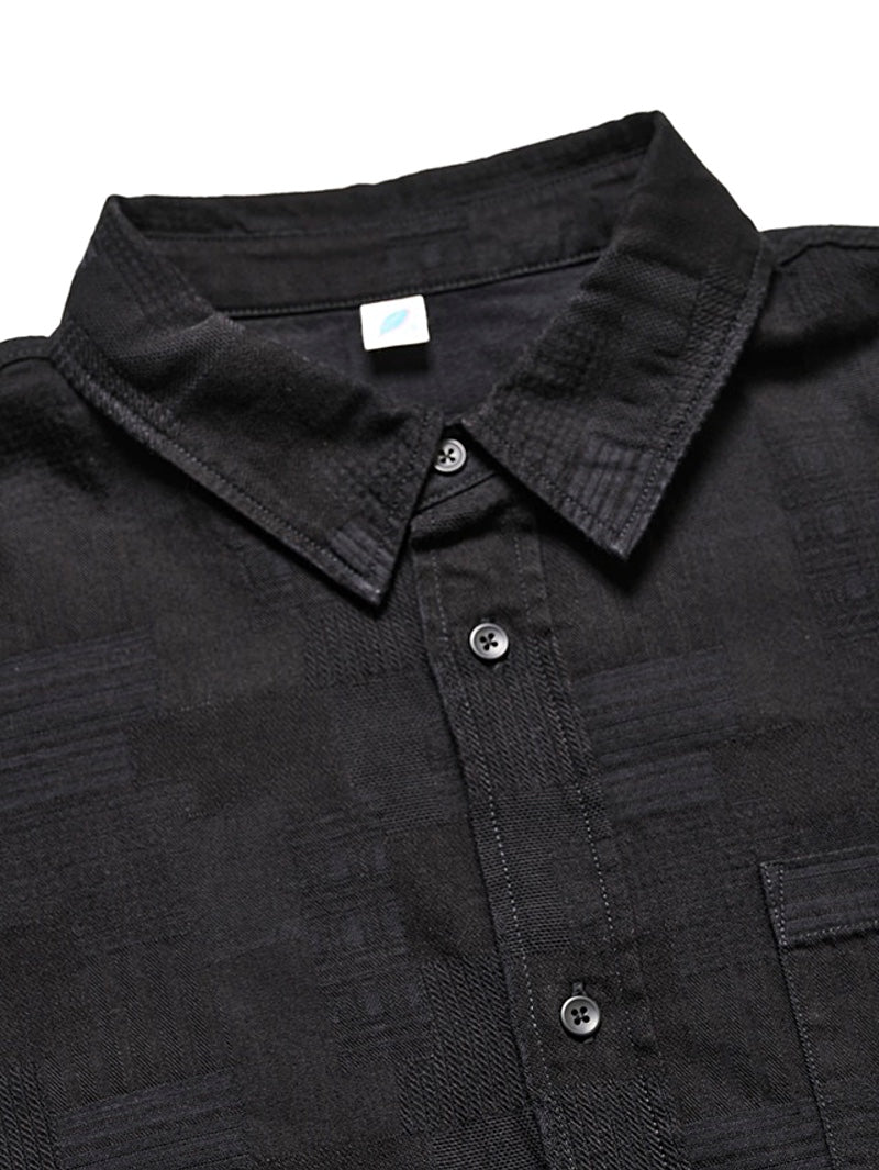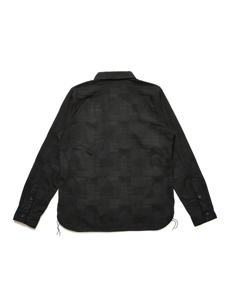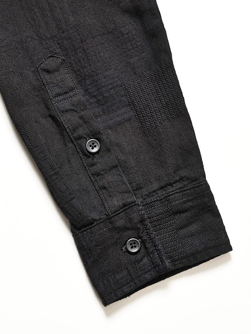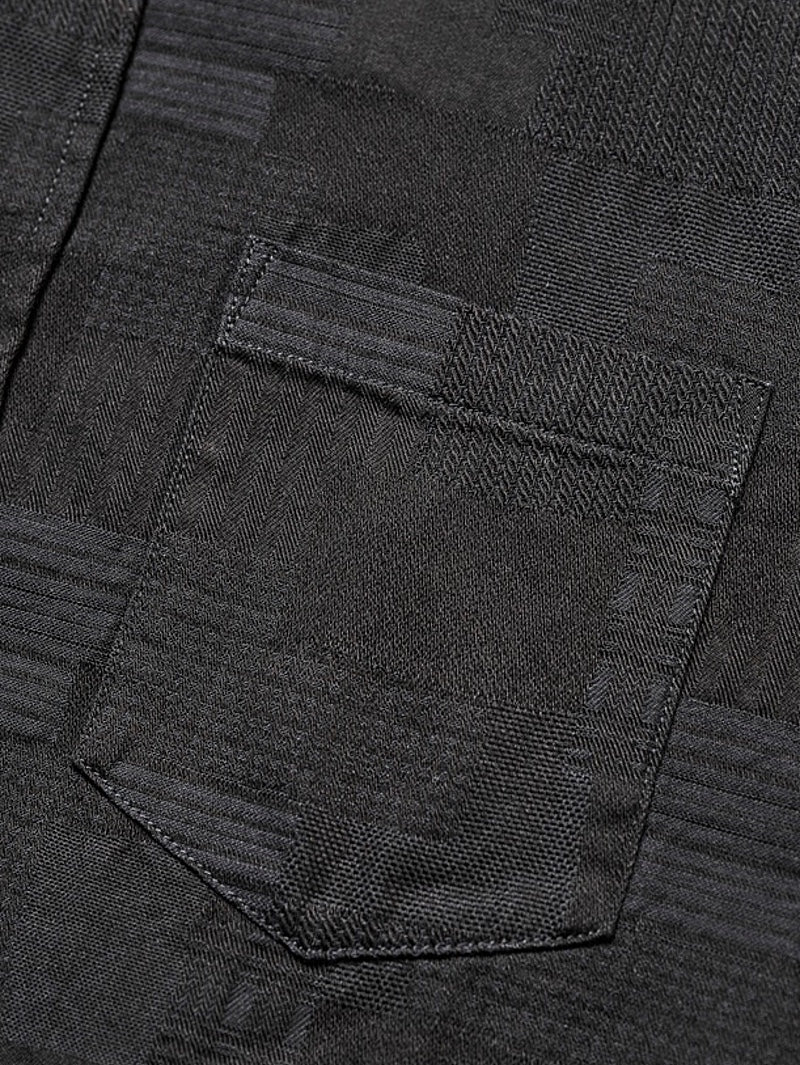 This shirt features a jacquard weave that creates a patchwork-like effect with a variety of patterns.