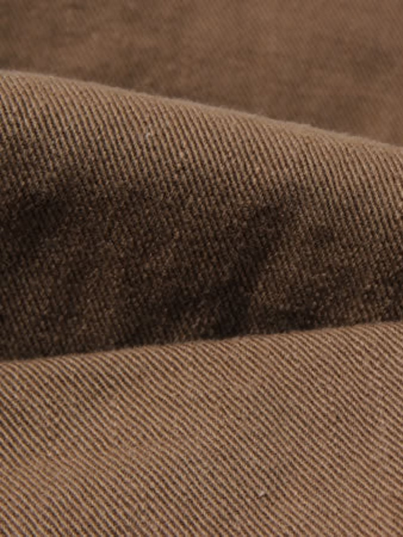 UES's classic chino has been a staple since the 2006 fall/winter collection. These chinos feature a thick fabric texture woven with uneven Zimbabwe cotton yarn and a clean silhouette. The shape is neither too wide nor too narrow, making them a classic and timeless piece. The olive brown color is very versatile and easy to match with work-style outfits. The cuffs are not too narrow, so they can be worn with work boots without any problems.
